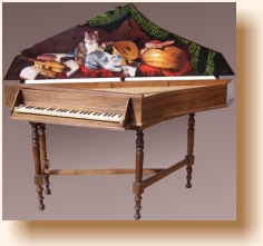 Elle mesure 170 cm de long, ce qui est une moyenne entre les deux époques. Elle a un jeu de 8 pieds. Seule une rosace de bois décore la table. Le couvercle est peint d'une nature morte aux instruments de musique et chats dont les éléments sont pris dans divers tableaux. Le piètement est en noyer dans l'esprit des instruments anglais.