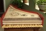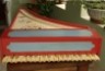 La caisse est en hêtre peinte en bleu et rouge La table n'a pas de décoration,mais elle possède trois rosaces découpées dans la table et deux peintes.